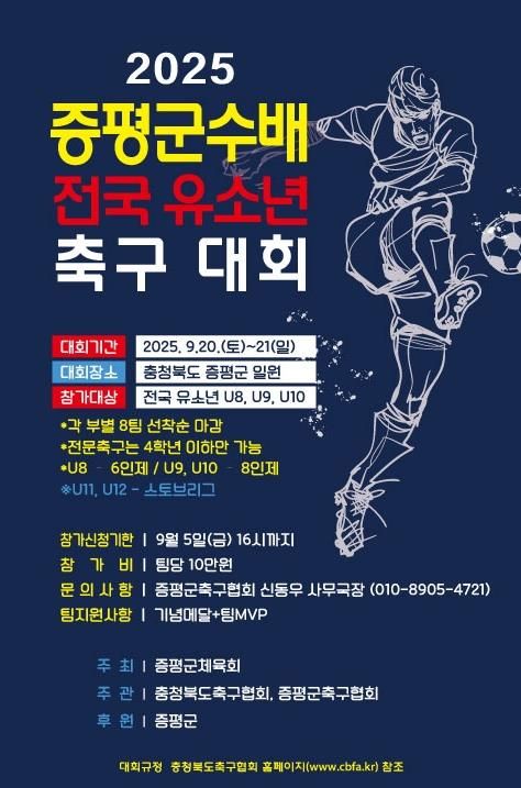 (포탈뉴스통신) 충북 증평군은 오는 19일부터 21일까지 증평종합운동장, 증평대교 잔디구장, 증평풋살경기장 등 3개 구장에서 ‘2025년 증평군수배 유소년축구대회’를 개최한다고 밝혔다.