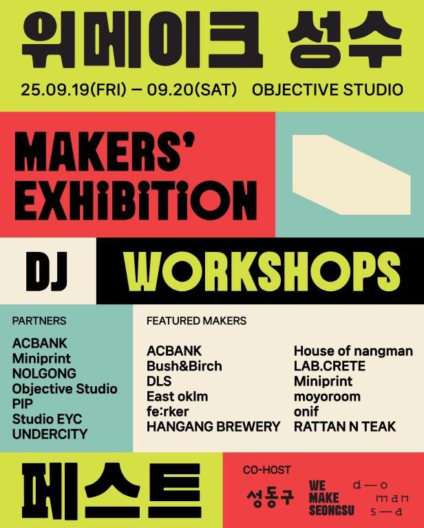 이번 축제는 성수동 제작 문화를 조명하고, 지역 브랜드와 로컬 크리에이터가 함께하는 프로그램으로 마련됐다. ‘위메이크페스트’는 로컬 메이커 커뮤니티 ‘위메이크성수’와 성동구가 공동 주최하고 도만사가 주관하며, 지역 제조업과 창작 활동을 소개하는 축제로 운영된다.
