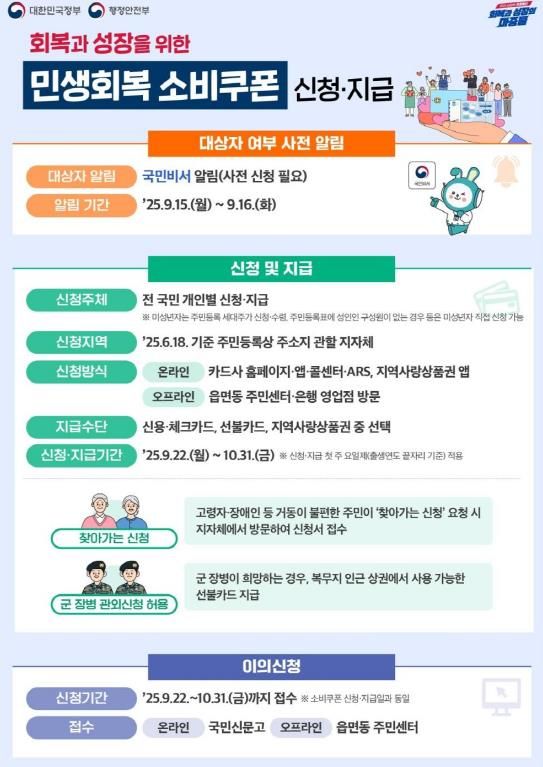 한편, 정부·카드사·지역화폐사는 민생회복 소비쿠폰과 관련해 URL이나 링크가 포함된 문자메시지를 발송하지 않는다며, 출처가 불분명한 문자의 인터넷 주소는 클릭하지 말고 즉시 삭제할 것을 당부했다.