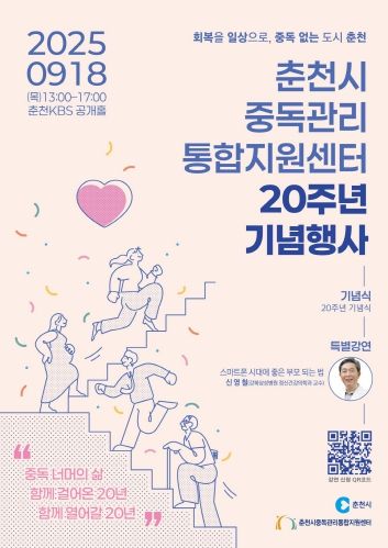 이번 기념행사는 지난 20년간 춘천시중독관리통합지원센터의 중독 예방과 회복 지원을 위해 이어온 발자취를 돌아보고 앞으로의 새로운 도약을 다짐하는 자리로 마련됐다. 1부에서는 기념식이 열리고 2부에서는 신영철 강북삼성병원 정신건강의학과 전문의가 ‘스마트폰 시대에 좋은 부모 되는 법’을 주제로 특별강연을 진행한다.