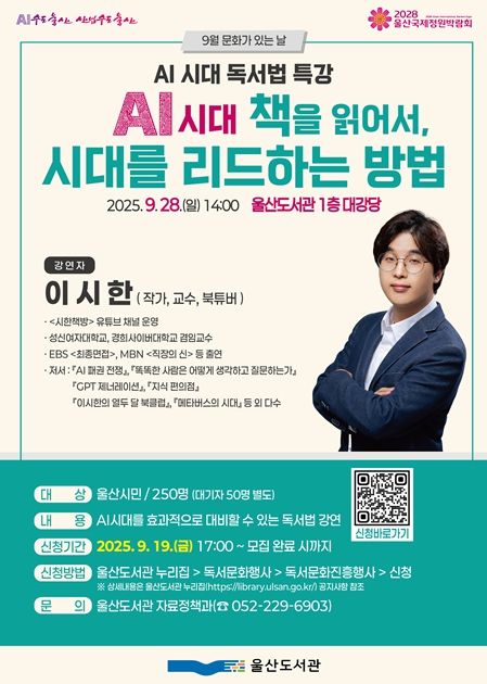 울산도서관 관계자는 “9월 마지막 주말 열리는 지역 학생들의 재능 나눔과 인공지능(AI) 시대에 맞는 독서법 특강을 통해 시민들의 지식과 감성을 동시에 충전하는 뜻깊은 시간이 되길 바란다” 라고 말했다.