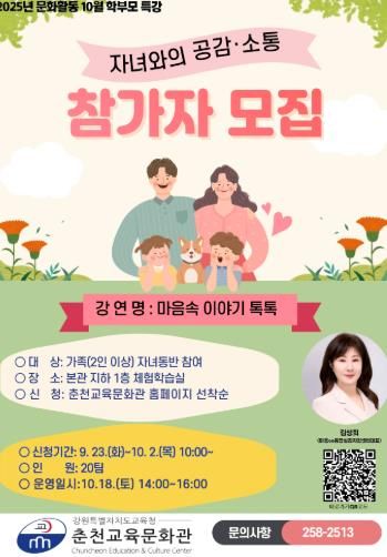 (포탈뉴스통신) 춘천교육문화관은 10월 18일과 11월 1일부터 11월 15일까지 매주 토요일에 자녀와 함께 참여하는 학부모 특강 ‘마음속 이야기 톡톡’과 ‘내 마음, 네 마음 쓰담쓰담’을 운영한다.