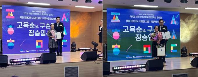 (포탈뉴스통신) 세종특별자치시교육청평생교육학습관은 문해교육을 통해 배움의 기쁨을 알아가고 있는 구순덕(1950년생)어르신과 장승임(1950년생)어르신이 9월 18일에 보람종합복지센터 대강당에서 열린‘2025년 전국 성인문해교육 시화전 행사’에서 글아름상을 수상했다고 밝혔다.