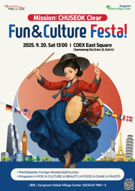 (포탈뉴스통신) 꿈이 모이는 도시, 미래를 그리는 서울시 강남구가 9월 20일 오후 1시부터 5시까지 코엑스 동측광장(영동대로 513)에서 외국인 주민과 관광객이 함께하는 다문화 축제 ‘펀앤컬처 페스타 Fun&Culture Festa! (미션 : 추석 클리어)’를 연다.