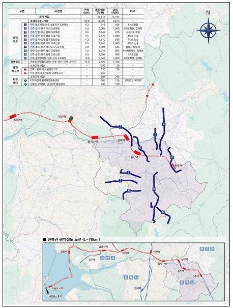 이번 사업 계획에는 △전주 중심 방사형 광역도로망 10개 노선(신설 5개, 확장 5개, 총연장 69㎞) △전주~새만금을 잇는 광역철도(76㎞, 9개 정차역) △버스·화물 공영차고지 2곳 △환승센터 2곳 조성 등 15개 핵심사업이 담겼다.