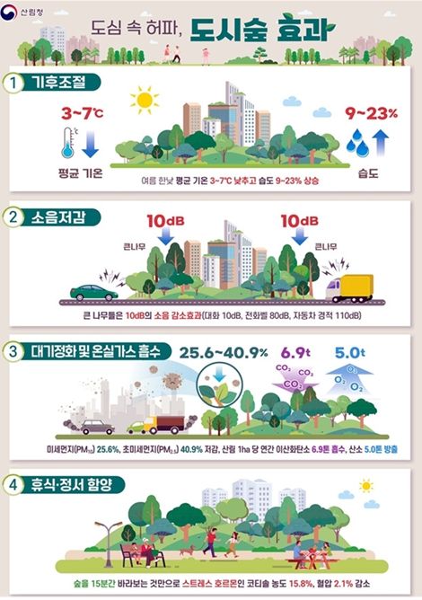 숲 1ha는 이산화탄소 연간 6.9톤, 미세먼지 168㎏ 등 대기 오염물질을 흡수하고(국립산림과학원), 도시숲은 여름 한낮 평균기온을 3~7℃ 낮춰주는 효과가 있다(산림청)는 연구 결과가 있다.