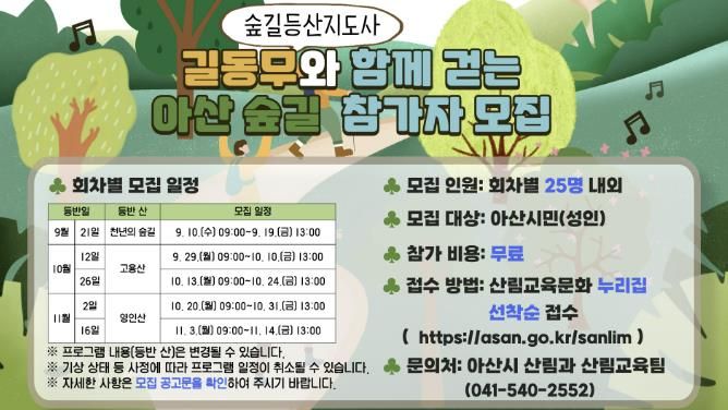 이병주 아산시 산림과장은 “이번 숲길 프로그램은 단순한 산행을 넘어 숲의 가치와 이야기를 배우고 건강을 증진하며 여가생활을 즐기는 기회”라며 “시민 여러분의 많은 관심과 참여를 바란다”고 말했다.