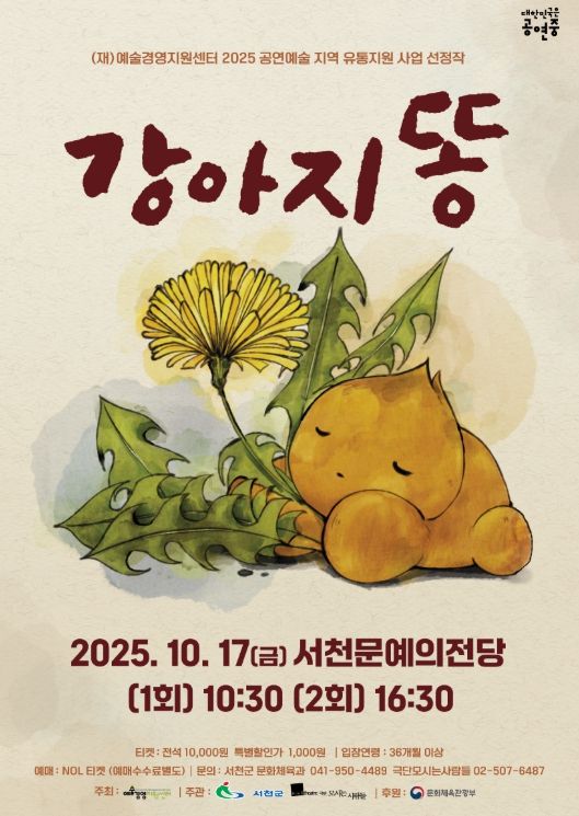 (포탈뉴스통신) 서천군은 문화체육관광부와 (재)예술경영지원센터가 추진하는 ‘2025 공연예술 지역유통 지원사업’에 선정된 어린이 연극 '강아지똥'이 오는 10월 17일 서천문예의전당 대강당에서 공연된다고 밝혔다.