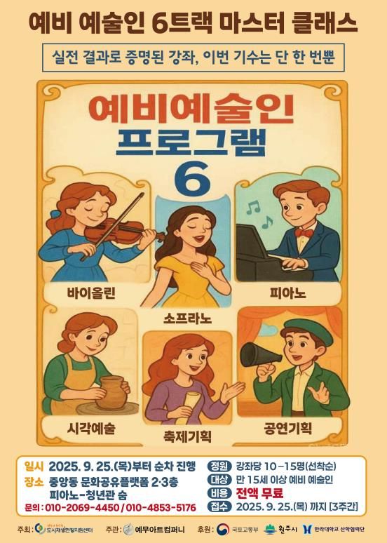 (포탈뉴스통신) 원주시 중앙동 도시재생현장지원센터가 주최하고, 예무아트컴퍼니가 주관하는 ‘예비 예술인 6트랙 마스터 클래스’가 오는 25일부터 중앙동 문화공유플랫폼에서 순차적으로 개강한다.