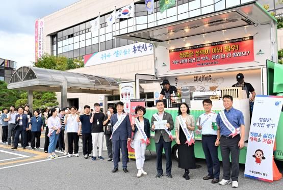 (포탈뉴스통신) 울산 중구가 9월 22일 낮 12시 중구청 본관 입구에서 전 직원을 대상으로 ‘청렴 한 잔할래요’ 청렴 커피차 홍보활동(캠페인)을 진행했다.