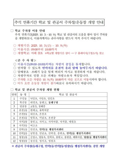 장준용 동래구청장은 “추석 연휴 동안 학교와 관공서 주차장을 무료로 개방해 주차 공간이 부족한 주택가를 찾는 귀성객들의 불편을 덜고, 안전하고 편안한 명절을 보내는 데 도움이 되길 기대한다”라고 말했다.