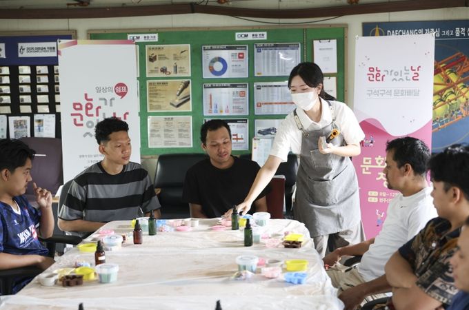 이번 프로그램은 근로자들이 희망한 ‘비누 만들기’로 진행됐으며, 네팔 출신 근로자 12명과 필리핀 출신 근로자 1명 등 총 13명이 참여했다. 근로자들은 각자 선호하는 재료를 선택해 다양한 모양의 비누를 제작하며 창의성을 발휘했고, 체험이 이어지는 동안 웃음과 활기로 가득했다.