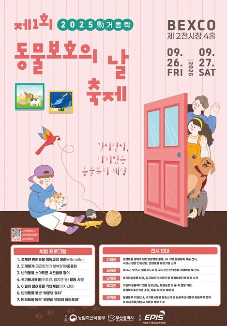 (포탈뉴스통신) 부산시는 농림축산식품부와 공동으로 오는 9월 26일부터 27일까지 이틀간 벡스코 제2전시장에서 '제1회 동물보호의 날 축제'를 개최한다고 밝혔다.