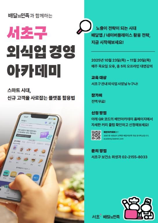 교육 모집 인원은 총 30명으로 서초구 내 외식업체 경영자라면 누구나 선착순으로 신청 가능하다. 신청은 배민아카데미 홈페이지를 통해 접수할 수 있으며, 참가비는 전액 무료다. 자세한 사항은 서초구보건소 위생과로 문의하면 된다.