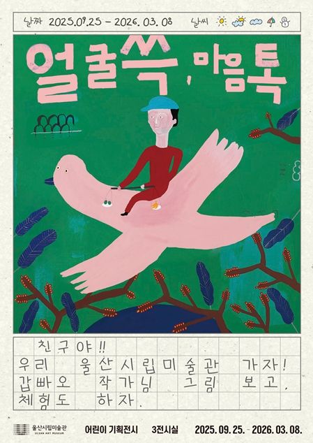 (포탈뉴스통신) 울산시립미술관은 오는 9월 25일부터 내년 3월 8일까지 1층 3전시실과 로비에서 어린이전시 ‘얼굴 쓱, 마음 톡’을 연다고 밝혔다.