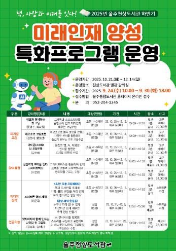 울주천상도서관 관계자는 “다양한 프로그램을 통해 지역주민이 문화적 풍요로움을 누리고, 도서관이 미래 교육의 선도적 공간으로 거듭나길 바란다”고 말했다.