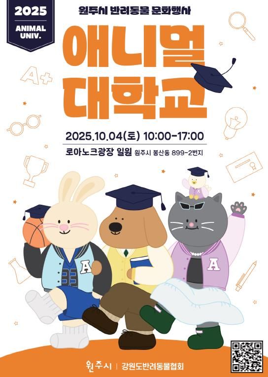 (포탈뉴스통신) 원주시농업기술센터는 10월 4일 오전 10시 원주천 로아노크광장에서 반려동물 문화행사 ‘애니멀 대학교’를 개최한다.