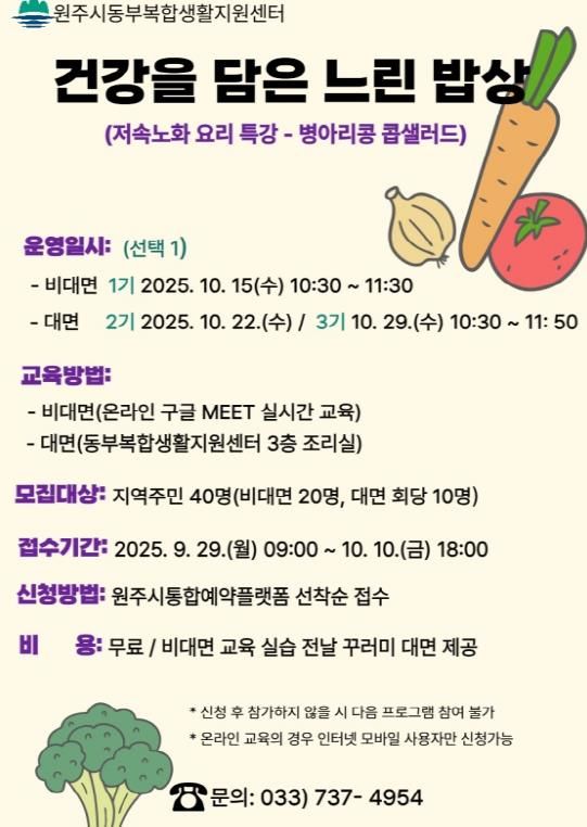 (포탈뉴스통신) 원주시동부복합생활지원센터는 오는 29일부터 저속노화 요리 특강 ‘건강을 담은 느린 밥상’ 프로그램 참여자를 모집한다.