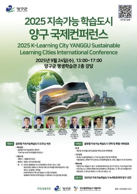 (포탈뉴스통신) 양구군은 24일 평생학습관에서 ‘2025 양구 지속가능학습도시 국제컨퍼런스’를 개최한다. 라틴아메리카 GNLC(Global Network of Learning Cities) 시장단 2명을 포함해 관계자 18명 등 총 21명이 초청되며, 양구군민과 평생교육 관계자 등 200여 명이 온·오프라인으로 함께한다.