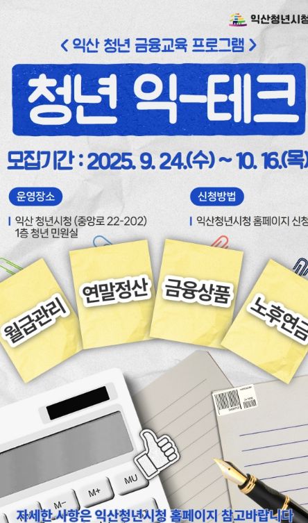익산시는 오는 10월 21일부터 12월 16일까지 청년 맞춤형 금융교육 '청년 익테크'를 진행한다고 23일 밝혔다.
