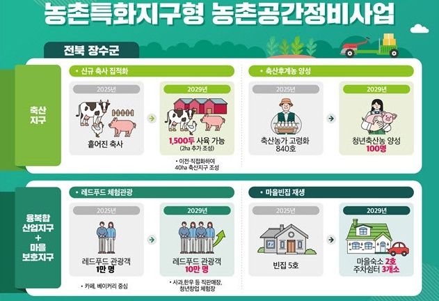 장수군은 오는 2029년까지 계남면 일원에 국비 50억 원, 도비 15억 원, 군비 35 억 원 등 총사업비 100억 원을 투입해 △ 장수한우(레드푸드) 축산지구, 레드푸드 융복합산업지구, 레드푸드 마을보호지구 등 세 구역은 연계 조성한다.