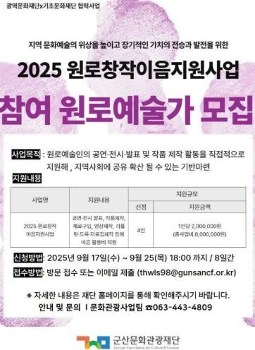 (포탈뉴스통신) 군산문화관광재단이 지역 문화예술발전에 헌신해 온 원로예술인의 창작 활동을 지원하는 ‘원로창작이음지원사업’을 추진한다.