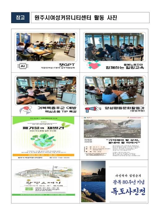 이영섭 원주시 여성가족과장은 “시민들에게 도움을 줄 수 있는 다양한 프로그램을 마련해 지역 성장에 이바지하겠다”라며, “센터에서 추진하는 교육에 많은 관심과 참여를 부탁드린다”라고 말했다.