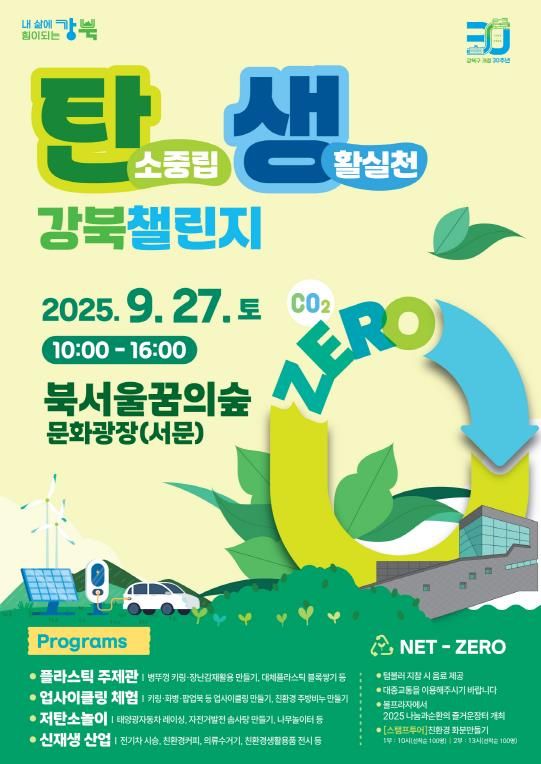 (포탈뉴스통신) 서울 강북구는 오는 9월 27일 오전 10시부터 오후 4시까지 북서울꿈의숲 일대에서 ‘탄생 강북 챌린지(탄소중립 생활실천 강북 챌린지)’와 ‘2025 나눔과 순환의 즐거운 장터’를 개최한다.
