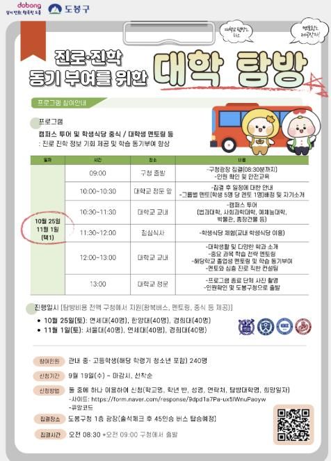 구는 서울대, 연세대 등 국내 최고 명문대학을 탐방하는 프로그램을 오는 10월 25일, 11월 1일 두 차례 운영한다고 밝혔다.