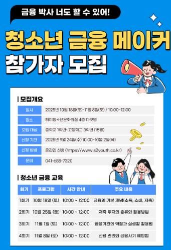 (포탈뉴스통신) 해미청소년문화의집은 오는 24일부터 2025년 청소년 특성화 프로그램‘청소년 금융 메이커’참가자를 모집한다고 밝혔다.