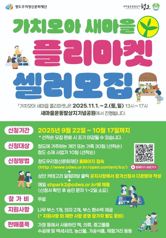 한편, 이번 행사의 핵심은 주민 셀러와 지역 업체의 직접 참여다. 모집대상은 청도군에 거주하는 가족 또는 개인셀러 30팀, 청도군소재 업체 10팀이며, 모집 분야는 핸드메이드 공예품, 중고물품, 농산물품, 가공식품, 체험프로그램 등이다. 참가신청은 홍보 포스터에 안내된 정보무늬(QR)코드를 통해 신청서를 작성해 제출하면 된다.