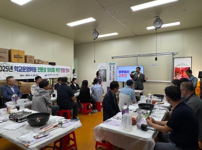 이번 연수는 전통 발효식품 제조 과정인 ‘블루베리 고추장 만들기 체험’을 통해 지역과 함께 성장하는 교육공동체를 실현하고, 학교운영위원의 역량과 리더십, 소통 능력을 배양하는 취지로 마련됐다.