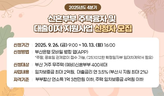 (포탈뉴스통신) 부산시는 올해 4분기 '신혼부부 주택융자 및 대출이자 지원사업'의 지원 대상자를 내일(26일)부터 10월 13일까지 모집한다고 밝혔다.