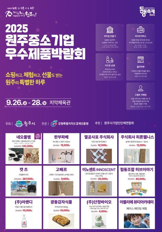 (포탈뉴스통신) 원주시가 주최하고 강원특별자치도경제진흥원이 주관하는 ‘2025 원주 중소기업 우수제품 박람회’가 오는 26일 오전 10시 30분, 치악체육관 무대에서 개막식을 열고 28일까지 3일간 이어지는 행사의 막을 올린다.