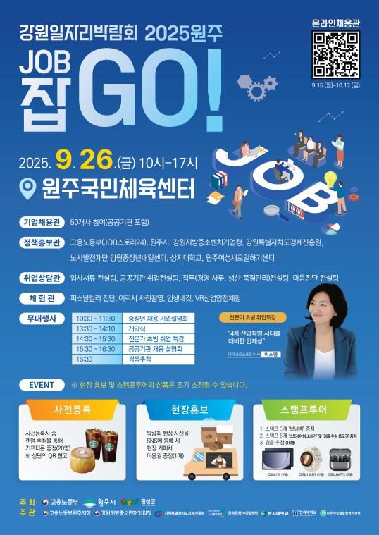 (포탈뉴스통신) 원주시와 고용노동부는 오는 26일 오전 10시부터 오후 5시까지 원주국민체육센터에서 ‘강원일자리박람회 2025 원주 잡(JOB) GO!’를 개최한다.