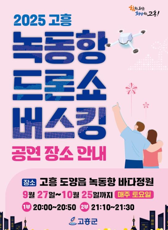 (포탈뉴스통신) 고흥군은 우주항공드론 및 지붕 없는 미술관 고흥을 방문하는 관광객과 군민을 위해 매주 토요일 저녁 8시, 녹동항 바다정원 일대에서 '2025 고흥 녹동항 드론쇼 버스킹'을 진행하고 있다고 밝혔다.