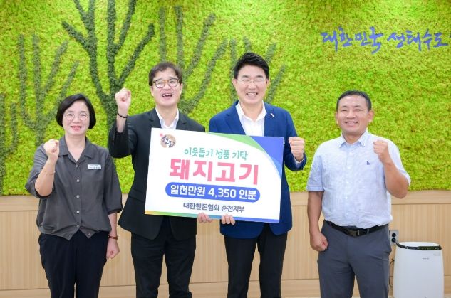 (포탈뉴스통신) 순천시는 25일 순천시청에서 (사)대한한돈협회 순천지부(지부장 김선일)와 일천만원 상당의 돼지고기 435박스(870kg) 전달식을 가졌다고 밝혔다.