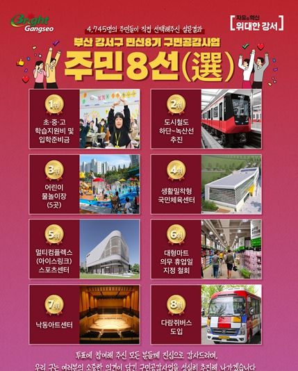 (포탈뉴스통신) 부산 강서구는 민선8기 3년간 추진한 주요 사업 가운데 주민이 직접 선정한 ‘주민 8선(選)’을 발표했다. 이번 조사는 지난 8월 14일부터 9월 13일까지 구 홈페이지(PC 또는 모바일)를 통한 온라인 설문 방식으로 진행됐으며, 총 4,745명이 참여해 큰 관심을 모았다.