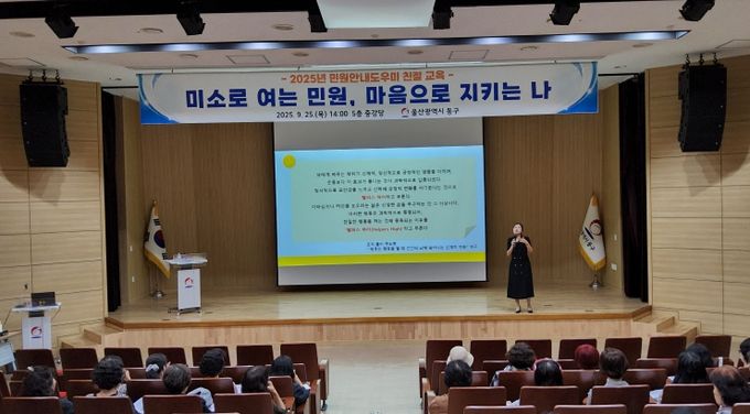 (포탈뉴스통신) 울산 동구는 9월 25일 동구청 5층 중강당에서 구청과 보건소, 종합사회복지관의 자원봉사 민원 안내 도우미 60여 명을 대상으로 친절 교육을 했다.