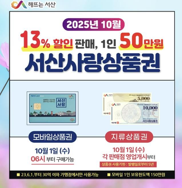 시는 서산사랑상품권 1인당 구매 한도를 기존 40만 원에서 50만 원으로 확대하며, 총 150억 원 규모로 발행한다.