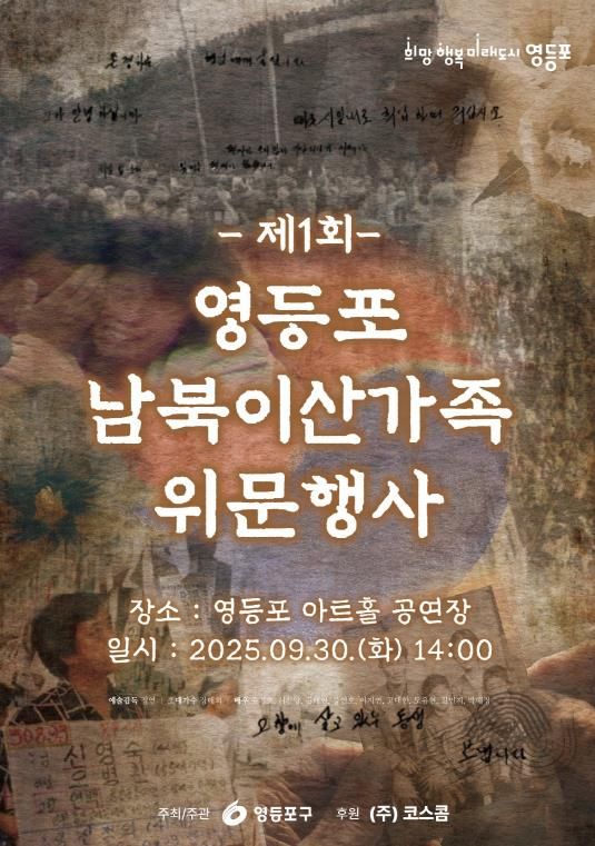 공연은 9월 30일 오후 2시 영등포 아트홀에서 열린다. 남북 이산가족과 후손, 지역 주민 등 누구나 사전 예약 없이 당일 현장 방문으로 관람할 수 있으며, 선착순 500석이 마련돼 있다. 자세한 사항은 구청 자치행정과로 문의하면 된다.