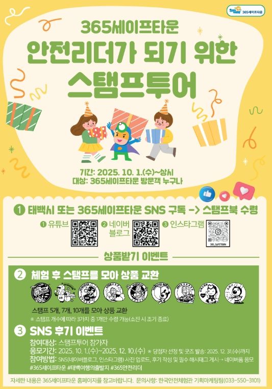 한편, 스탬프투어 참여자를 대상으로 SNS 후기 이벤트도 함께 진행되며, 자세한 사항은 365세이프타운 홈페이지에서 확인할 수 있다.