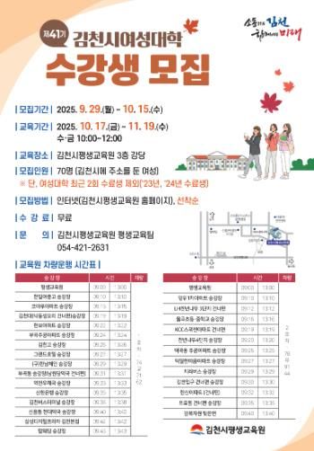 제41기 김천시여성대학은 전액 무료로 운영되며, 수강 신청은 김천시평생교육원 공식 누리집을 통해 가능하다.