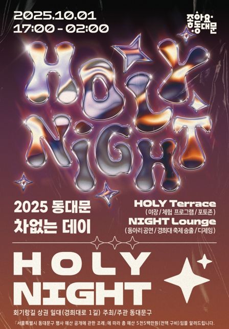 (포탈뉴스통신) 서울 동대문구는 오는 10월 1일 오후 5시부터 다음날 오전 2시까지 회기역 인근 회기랑길(경희대로1길 및 경희대로1가길 일대)에서 ‘2025 차없는 데이-HOLY NIGHT’ 행사를 개최한다고 밝혔다.