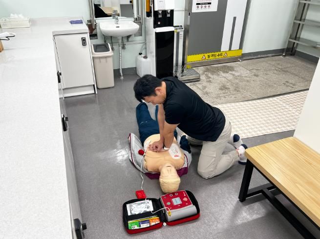 이번 훈련은 이용자가 남자 탈의실 내에서 심정지로 쓰러진 상황을 가정하여 진행됐으며, 실제상황 못지 않은 긴장감 속에서 신속한 초기 대응과 협력 체계를 점검하는 계기가 됐다.