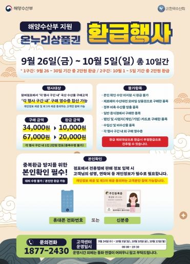 행사 기간 중 국산 수산물 또는 농축산물을 3만 4천 원 이상 구매 시 온누리상품권 1만 원, 6만 7천 원 이상 구매 시 온누리상품권 2만 원을 환급받을 수 있다.