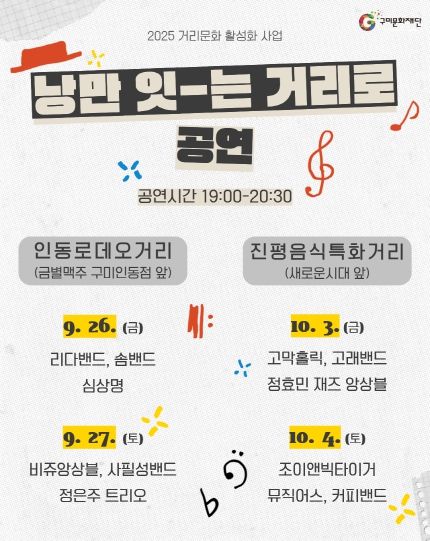 9월 26일·27일, 10월 3일·4일 총 4회 열리는 ‘로데오거리‧진평음식특화거리 활성화 공연’은 추석 연휴에 맞춰 시민과 귀성객이 함께 즐길 수 있는 열린 무대로 마련된다. 오후 7시에 시작되는 이번 공연은 ▲리다와 솜밴드, 심상명밴드가 해금·생황·카혼·기타 등 다양한 악기로 독창적인 무대를 선사하는 1회차(9. 26. 인동로데오거리), ▲비쥬앙상블, 사필성밴드, 정은주 트리오가 앙상블 연주와 재즈의 매력을 전하는 2회차(9. 27. 인동로데오거리), ▲고막홀릭, 고래밴드, 정효민 재즈 앙상블이 가을밤을 재즈 선율로 물들이는 3회차(10. 3. 진평음식특화거리), ▲조이앤빅타이거, 뮤직어스, 커피밴드가 거리를 열정과 낭만으로 채우는 4회차(10. 4. 진평음식특화거리) 공연으로 구성된다. ‘문화가 스며드는 거리’라는 콘셉트 아래 거리를 공연장으로 바꿔 새로운 문화 경험을 시민들에게 선사한다.