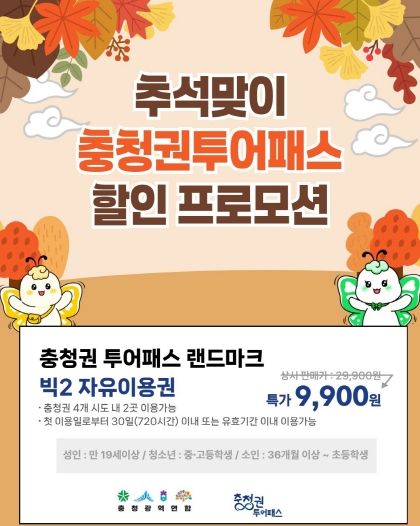 이번 프로모션에서는 충청권투어패스 ‘빅2(2곳 이용권)’ 상품을 정상가 29,900원에서 2만원 할인된 9,900원에 제공한다. 판매 수량은 총 3천 매 한정이며, 9월 26일부터 10월 12일까지 네이버 스마트스토어를 통해 구매할 수 있다. 사용 기한은 10월 31일까지다.