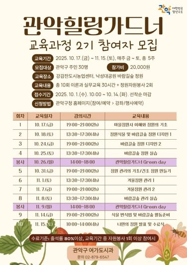 (포탈뉴스통신) 관악구가 주민이 행복한 힐링·정원 도시 조성을 위해 마을 정원사 ‘관악 힐링 가드너’ 2기 교육생을 모집한다.