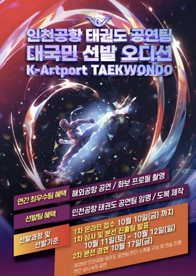 (포탈뉴스통신) 인천국제공항공사는 인천공항에서 진행되는 태권도 상설공연인 ‘2025-2026 인천공항 태권도 상설공연’에 참여할 태권도 전문 공연팀을 공개 모집한다고 28일 밝혔다.